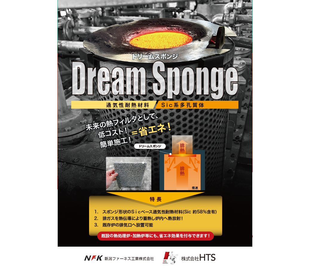 通気性断熱材量:Sicシリコンカーバイトフォームである「ドリームスポンジ」は、低コスト、簡単施工を実現した未来の熱フィルタとして省エネ効果を得ることができ、既存炉の排気口へ簡易に設置が可能のため、既設の熱処理炉・加熱炉等に、省エネ効果を付与できます!