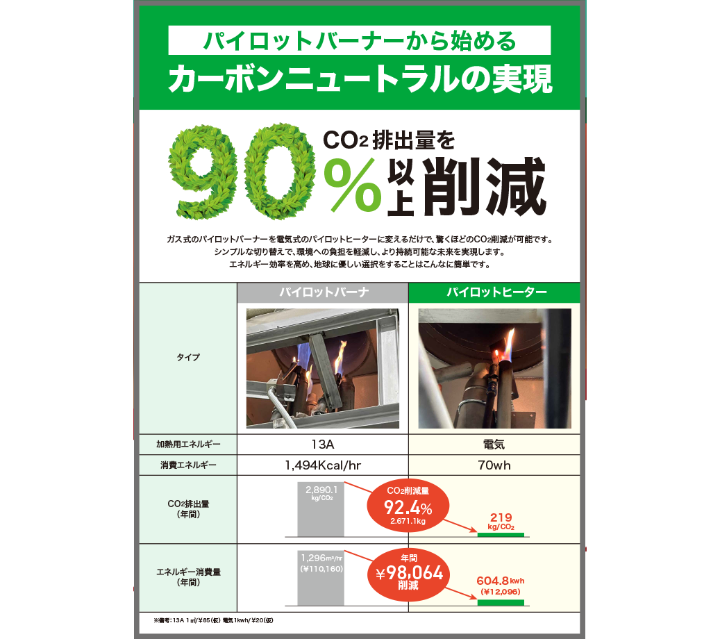 ガス式のパイロットバーナーを電気式のパイロットヒーターに変えるだけで、驚くほどのCO2削減が可能です。シンプルな切り替えで、環境への負担を軽減し、より持続可能な未来を実現します。エネルギー効率を高め、地球に優しい選択をすることはこんなに簡単です。
